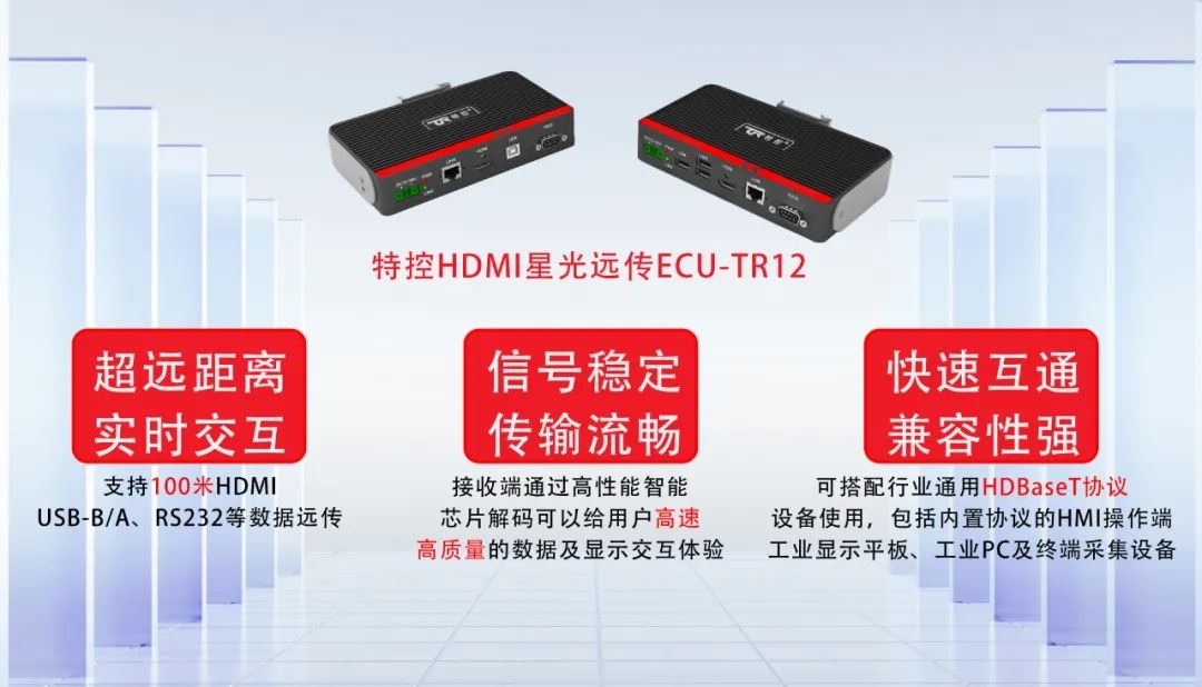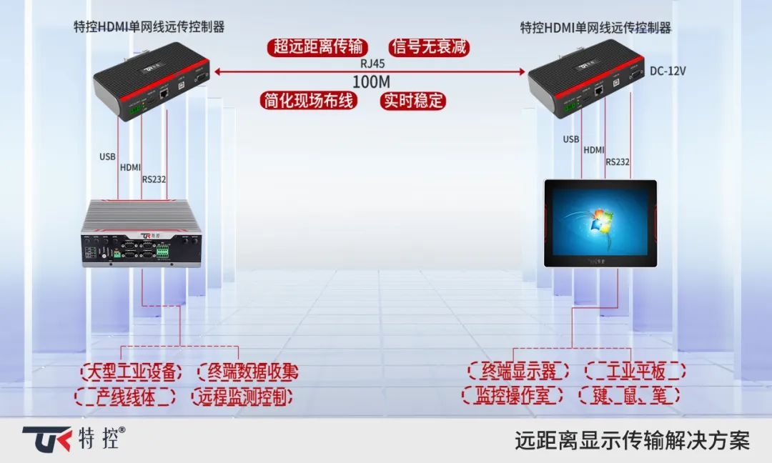 工業(yè)設(shè)備的迅速發(fā)展,隨著尺寸變大,主機與顯示器的距離隨之變長。設(shè)備功率也越來越大,隨之帶來的電磁干擾也是越來越強。在這種長距離強干擾的應(yīng)用環(huán)境,加上HDMI/DVI/VGA自身信號傳輸?shù)哪芰τ邢?,就算使用高?guī)格線材也無法適用這樣的應(yīng)用環(huán)境。特控深研客戶現(xiàn)場需求,以解決客戶實際問題為目的,推出遠(yuǎn)距離傳輸控制解決方案。