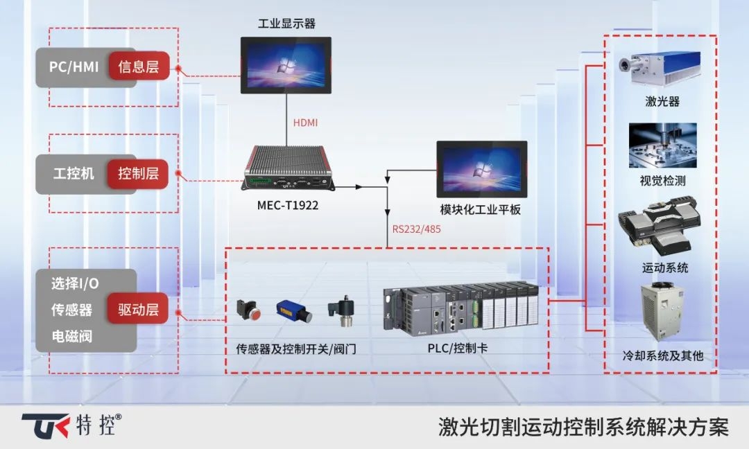 激光切割運動控制系統(tǒng)解決方案以特控工控機MEC -T1922基礎(chǔ),結(jié)合激光器、冷卻系統(tǒng)控制系統(tǒng)等控制數(shù)字信號輸入輸出,從而生成控制指令完成復(fù)雜的加工,這種切割方式比傳統(tǒng)切割方式更高效、精度更好,也具備切割厚度上的優(yōu)勢,更能滿足工程機械行業(yè)厚板金屬高效率、高精度切割的需要,孕育著高功率激光切割機的廣闊市場。